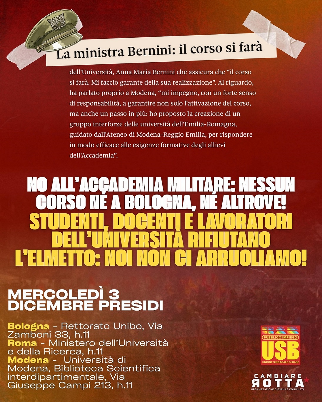 No all’accademia militare: nessun corso né a Bologna né altrove! Studenti, lavoratori e docenti rifiutano l’elmetto: noi non ci arruoliamo